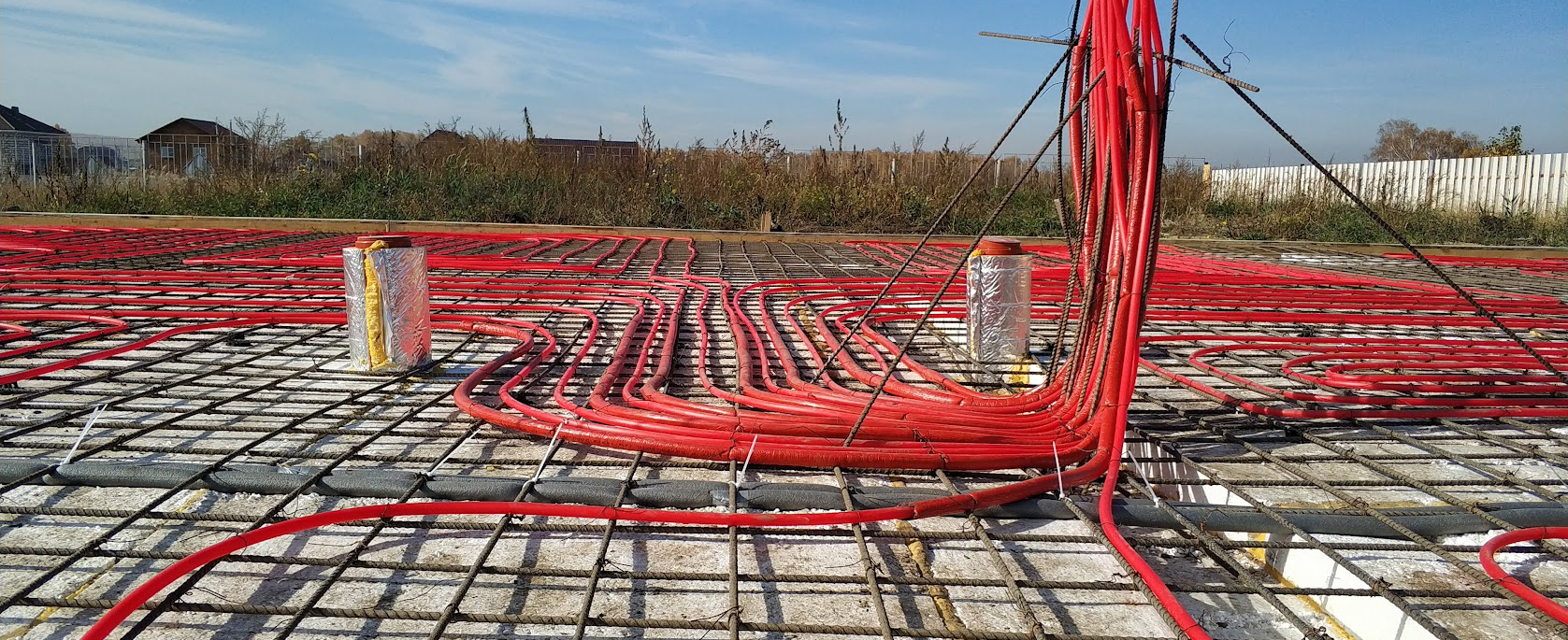 Проектирование и реализация фундамента Утепленной Шведской Плиты (УШП). Укладка всех коммуникаций и отопления непосредственно в саму фундаментную плиту. На фото опрессовка труб перед заливкой бетона.